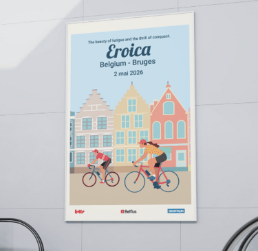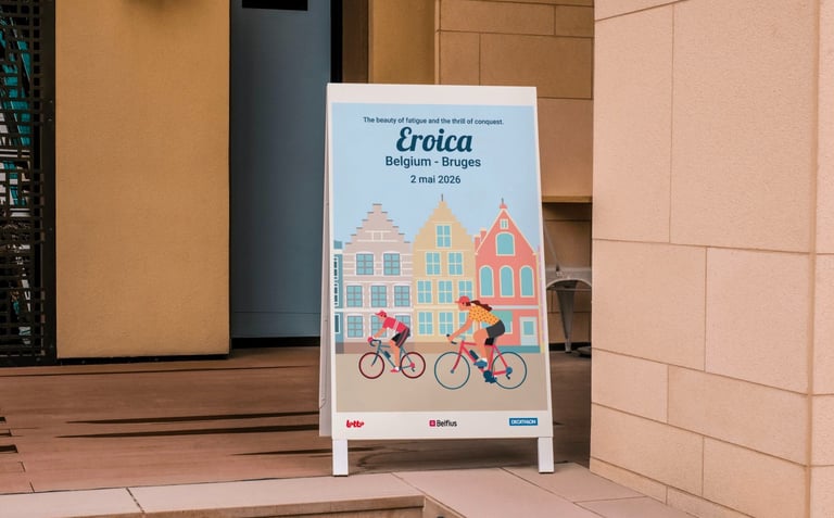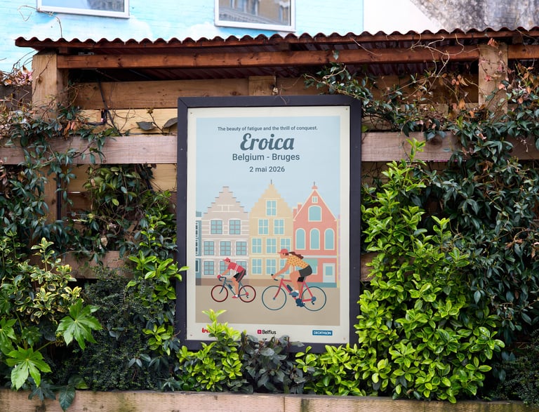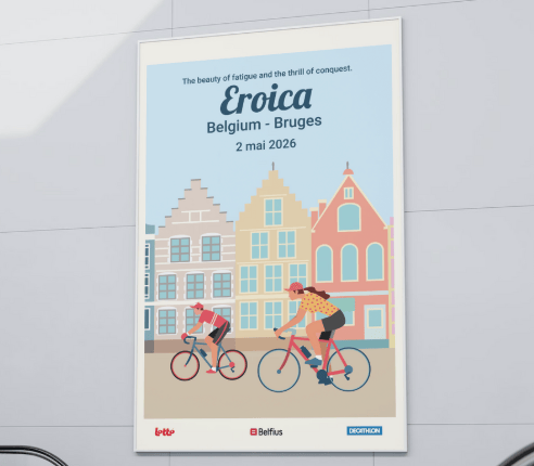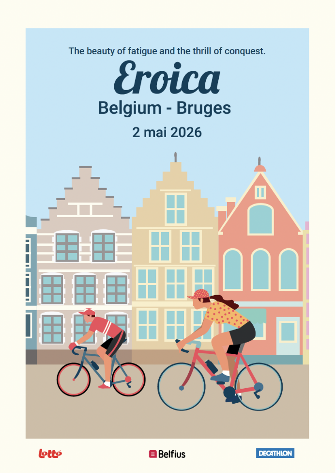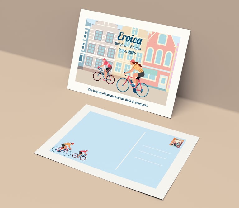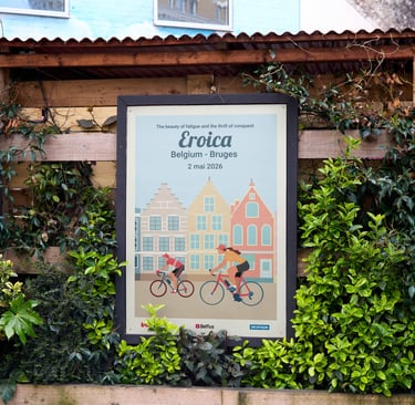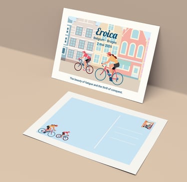 Chaque élément visuel révèle une ambiance : le vélo ancien au centre, entouré de cyclistes chevronnés – maillots de laine, sacoches en cuir, guidons courbés. Les roues tournent en arabesques gracieuses, comme un hommage au cyclisme d'antan qui traverse les époques.
