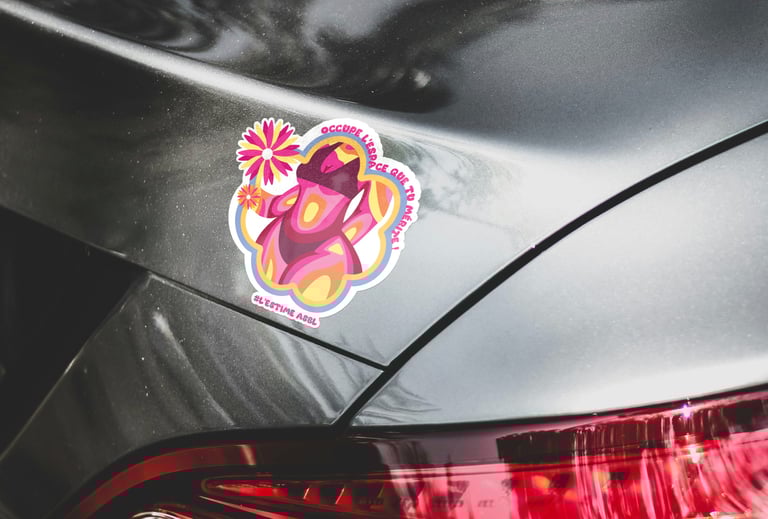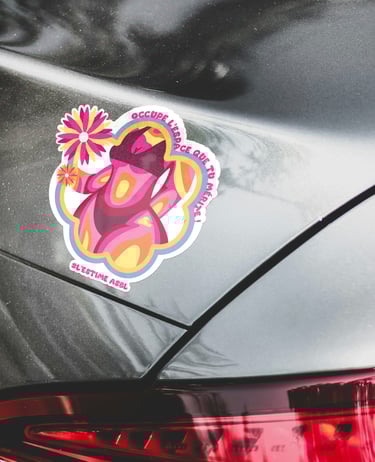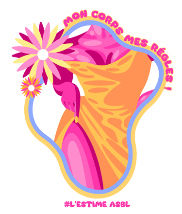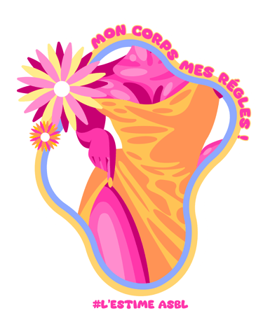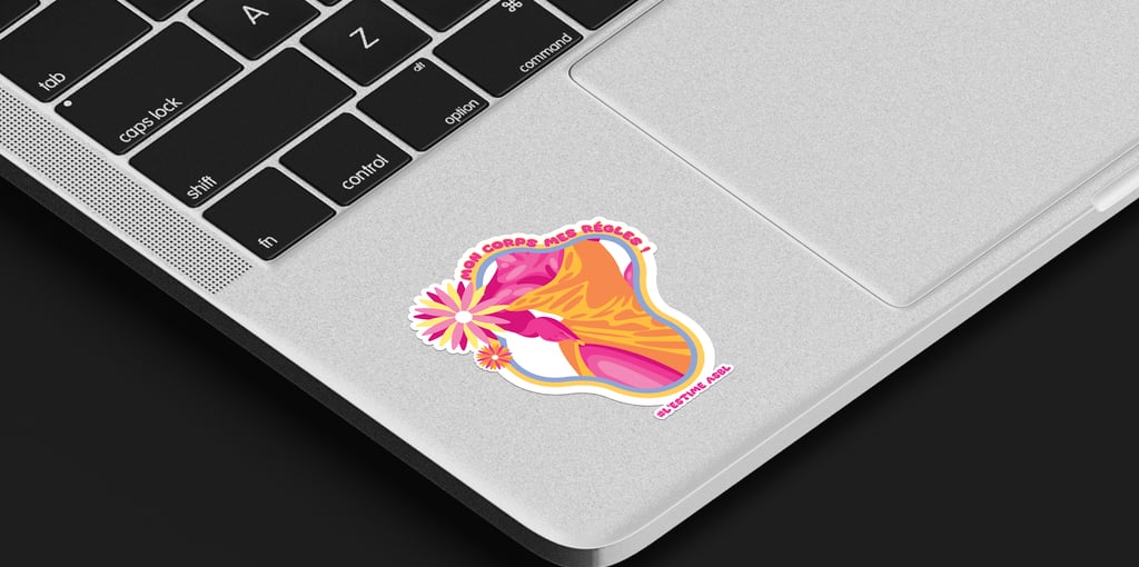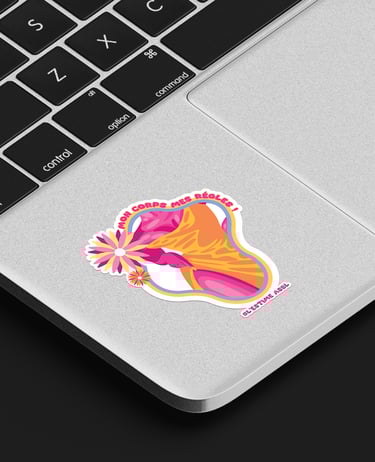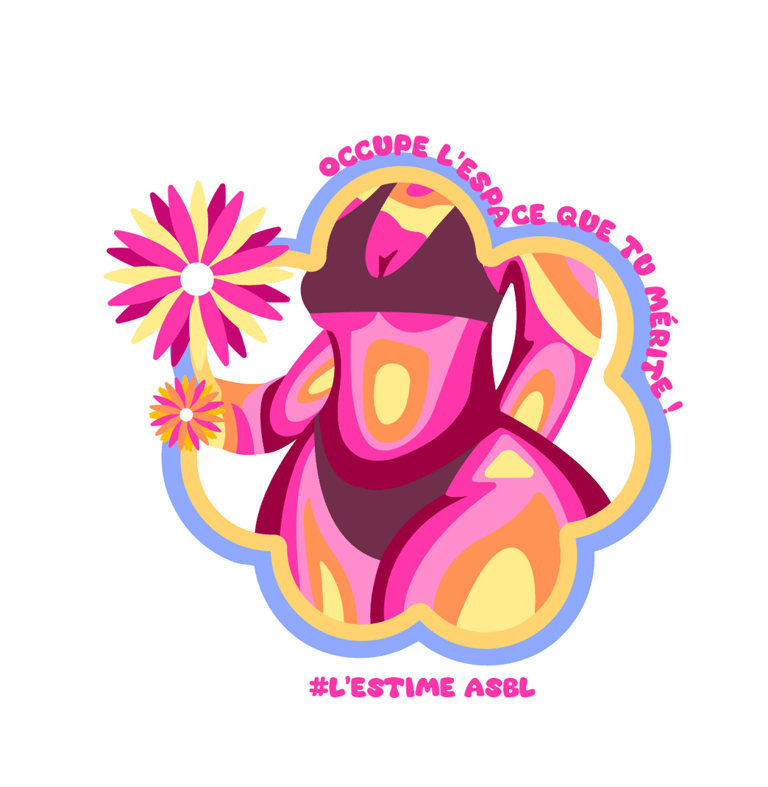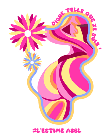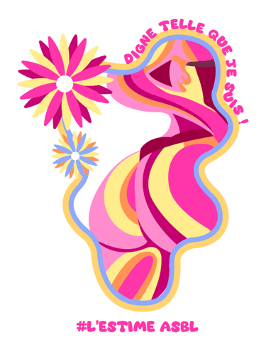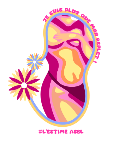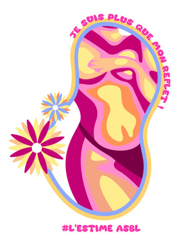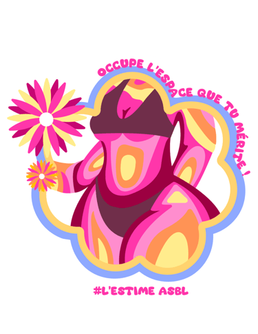 Chaque visuel révèle une intention : des corps de toutes formes encadrés de contours fluides et colorés, ornés de fleurs qui éclosent comme autant de symboles de renaissance. Les slogans s'enroulent autour des silhouettes – « Digne telle que je suis ! », « Mon corps mes règles », « Occupe l'espace que tu mérites ! » – transformant chaque autocollant en manifeste de poche. Les formes organiques ondulent, refusent la rigidité, célèbrent le mouvement.