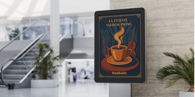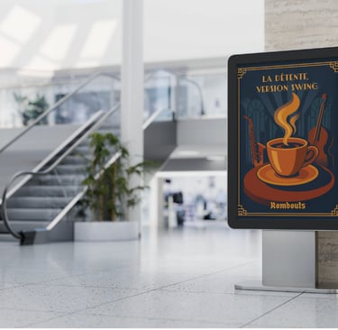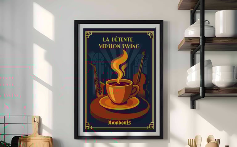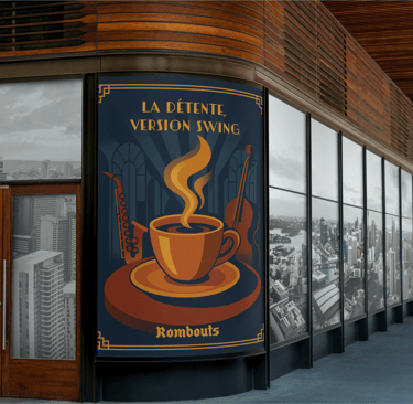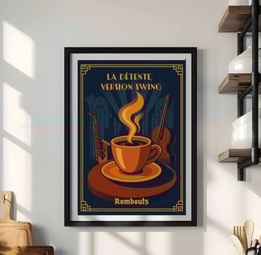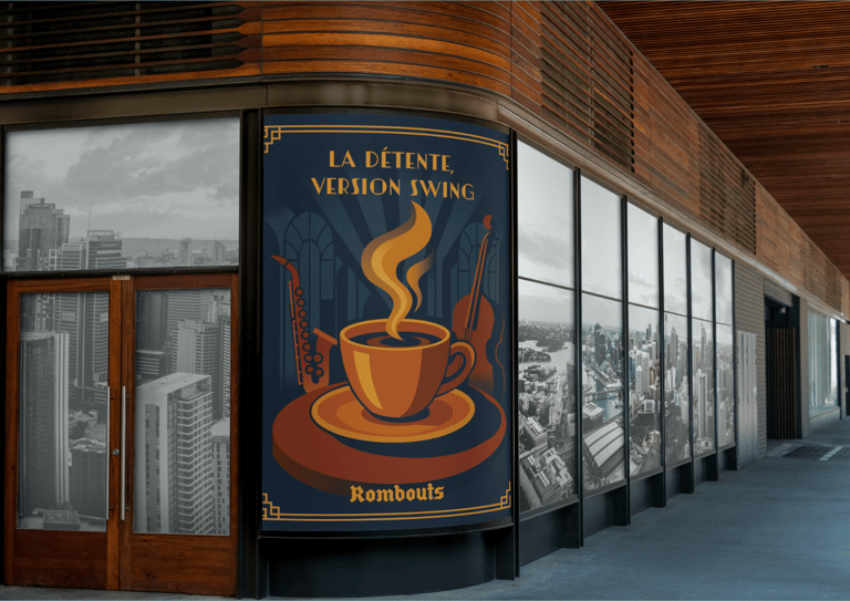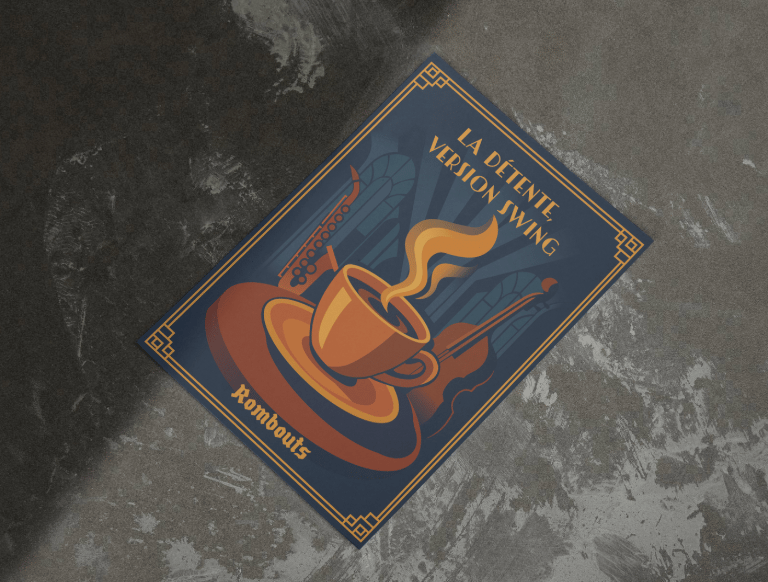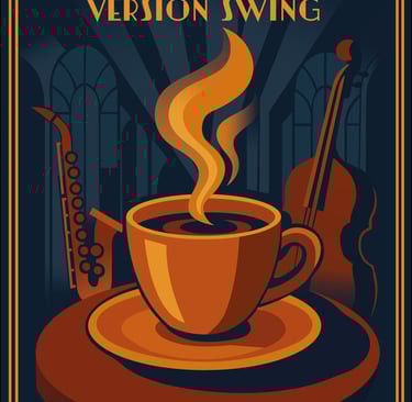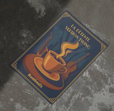 Dans ce projet, j'ai exploré l'alliance entre café et musique swing pour inviter chacun à savourer l'instant autrement. À travers des géométries Art Déco et une palette bleu nuit et or, j'ai créé une affiche singulière.